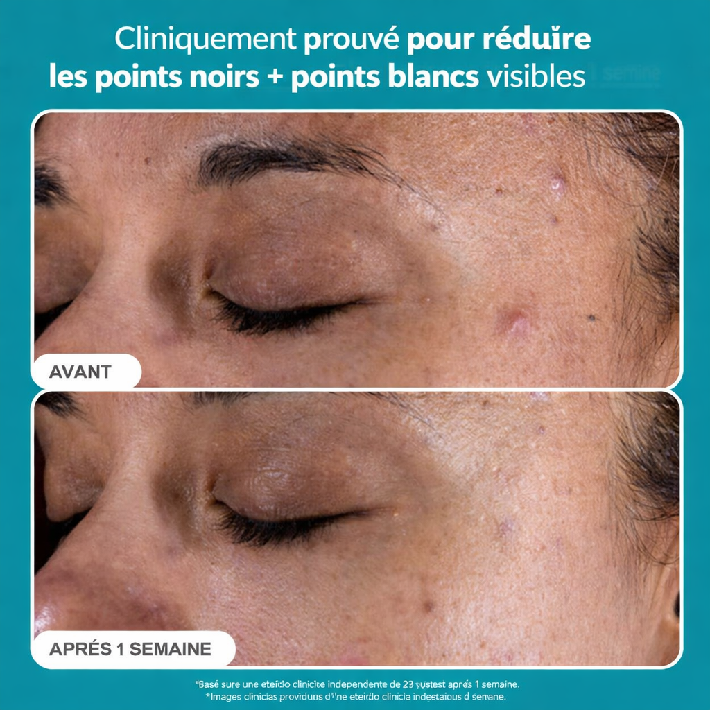 En ciblant l’intérieur des pores, la peau se transforme progressivement. En quelques semaines, les points noirs diminuent, les pores paraissent moins visibles et la texture de la peau devient plus lisse, plus régulière et visiblement plus nette.